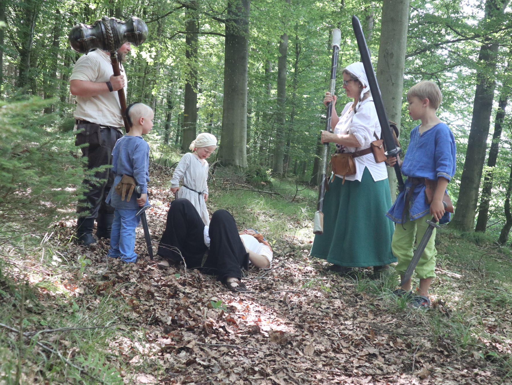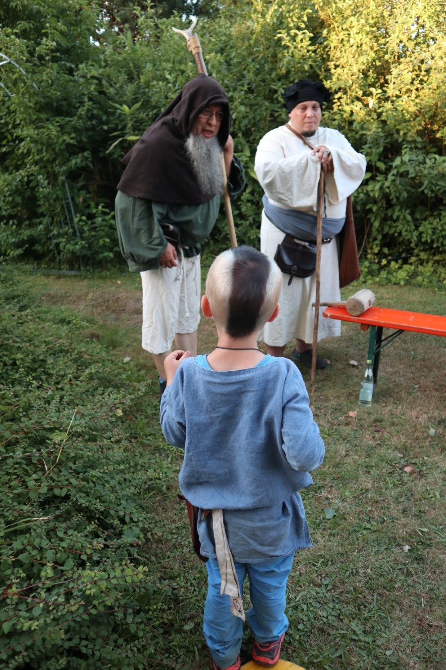 Ebenfalls wichtig zu erwähnen ist, dass wir uns erhoffen, den Kindern allzu große Überraschungen am nächsten Morgen zu ersparen. Weder nächtliche Weltuntergangsrituale noch der plötzliche Tod der Eltern oder ähnlich gravierende Einschnitte sind auf unserer Con erwünscht. Nicht weil wir das nicht toll finden, sondern weil wir den Kindern, der nächsten Larp-Generation, keine Angst vor dieser ganz besonderen Welt machen wollen. Umso entspannter die Kinder mit diesen vielen neuen Eindrücken umgehen, umso entspannter sind auch deren Eltern. Und umgedreht. So ist auch das verhaltensverändernde Verzaubern von Mitspielern mit Bedacht vorzunehmen. Rollenspiel muss Rollenspiel bleiben und Kinder dürfen ruhig eine besondere Atmosphäre wahrnehmen, aber geht behutsam vor oder sprecht öfter als gewöhnlich eure Vorhaben mit der Umgebung oder der Orga ab. Das macht es allen leichter, kindgerecht zu reagieren.