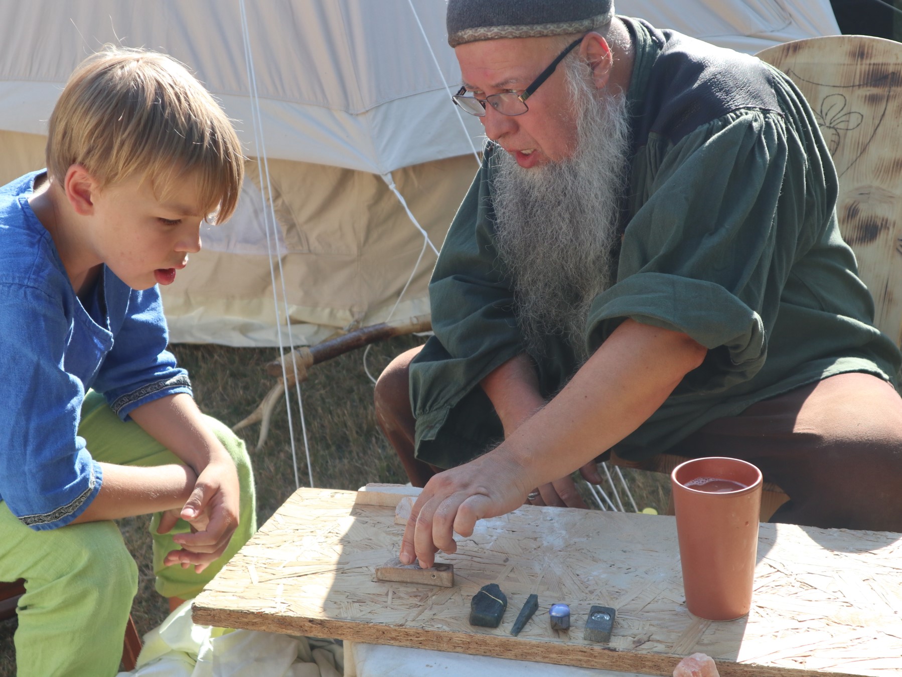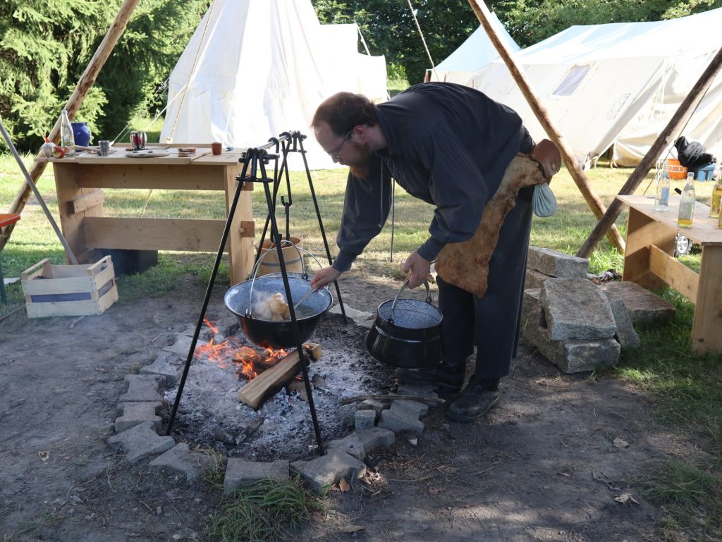 Unter einem großen Feuersegel befindet sich das Herz der Siedlung, die Feuerstelle. Der gute Heinrich, Siedler der ersten Stunde, kocht hingebungsvoll über offenem Feuer alle gemeinsamen Mahlzeiten. Neben einfachen Grieß- und Mehlspeisen zaubert er auch Braten, Klöße oder Süßes, wenn es die kargen Speisekammern der Einwohner hergeben. In den kalten Abendstunden laden kleine Bänke zum Aufwärmen am Lagerfeuer ein, welches quasi den gesamten Tag – so gewollt – wohlige Wärme spendet.